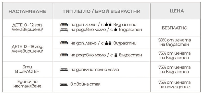 * В посочените цени не е включен туристически данък, който се доплаща, в размер на 2.73 BGN /1.39 EUR с ДДС на възрастен и дете над 12 години, на ден.